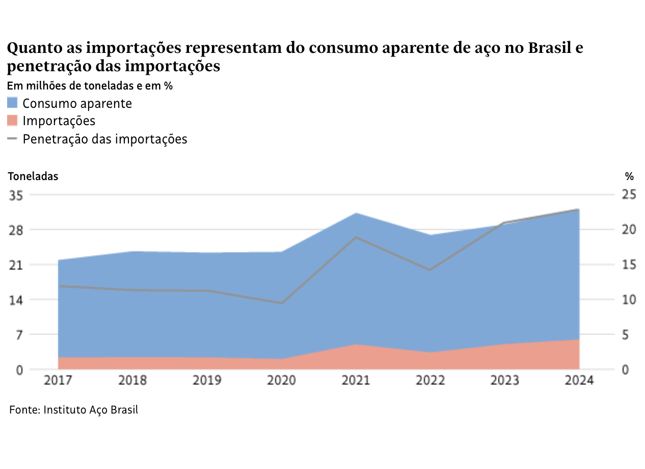 Dados compilados pelo Instituto Aço Brasil, que representa as siderúrgicas no país, apontam que as importações de aço pelo mercado brasileiro saltaram de 2,3 milhões de toneladas em 2017 para quase 6 milhões de toneladas em 2024. E o crescimento do mercado brasileiro não acompanhou com a mesma proporção: em 2017, as importações representavam 12% do consumo aparente de aço no Brasil; já no ano passado, 23%.